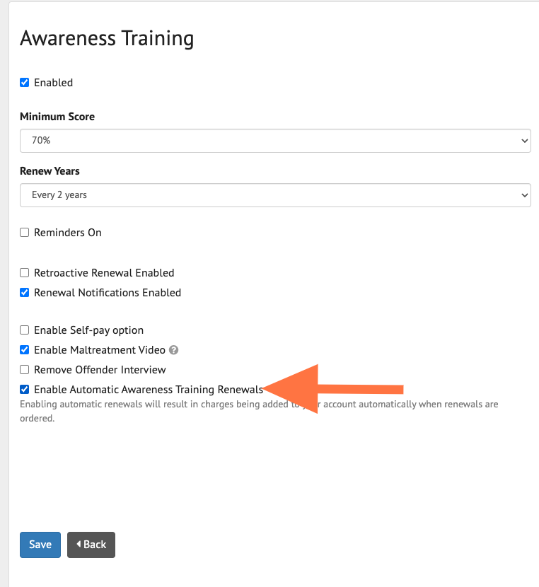 - Check ‘Enable Automatic Awareness Training Renewals’ and click ‘Save.’