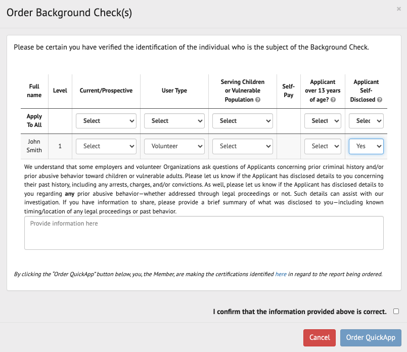 When ordering a Background Check, you may include the applicant’s self-disclosed information.