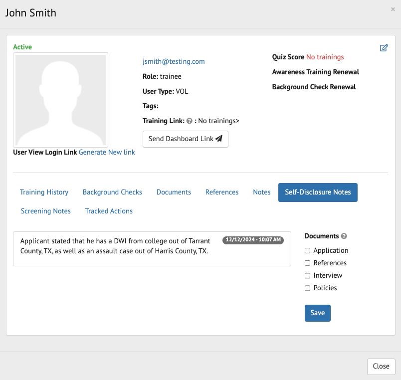 Use the ‘Applicant Self-Disclosed’ option if the applicant has disclosed information about past (or current) criminal history, or if you are currently aware of any offense committed by the applicant.