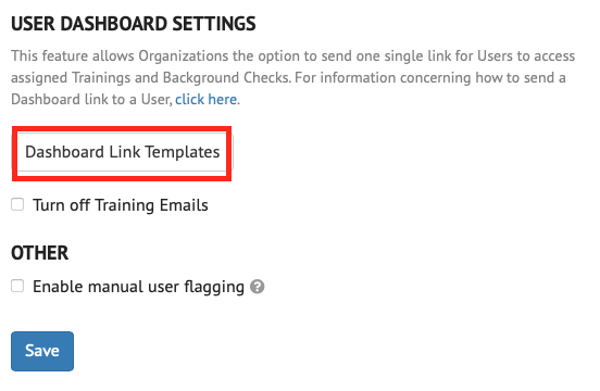 - Locate the ‘User Dashboard Settings’ and click the ‘Dashboard Link Templates’ button.