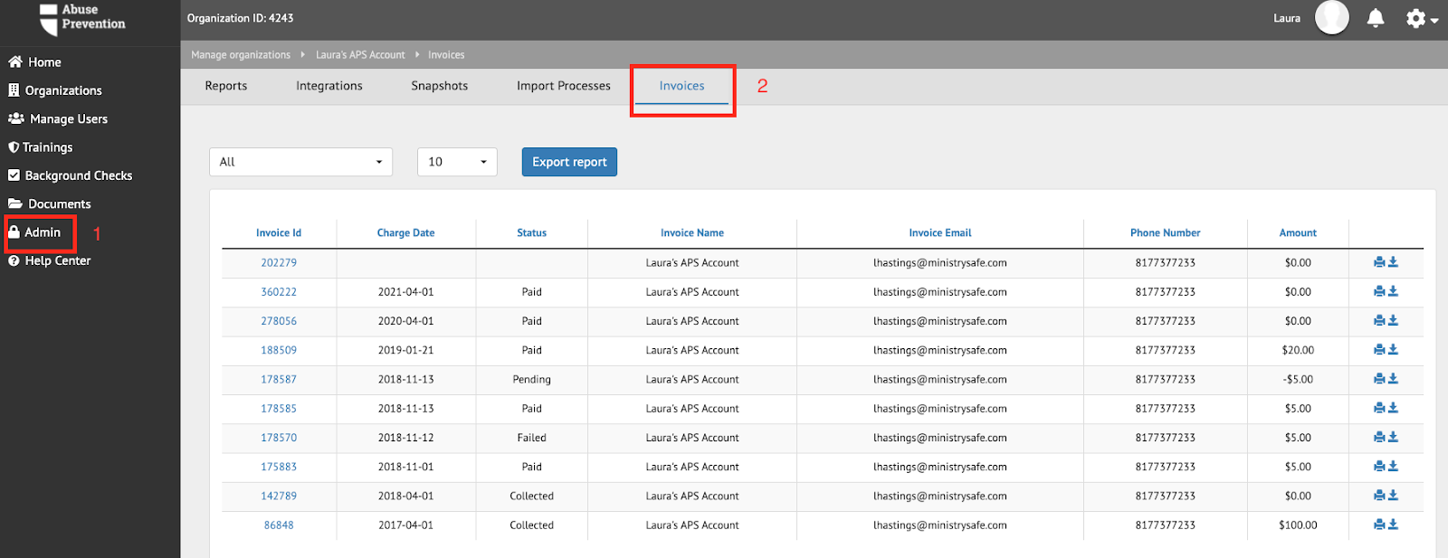 Click ‘Admin’ in the left-hand menu and select ‘Invoices’ in the top toolbar.