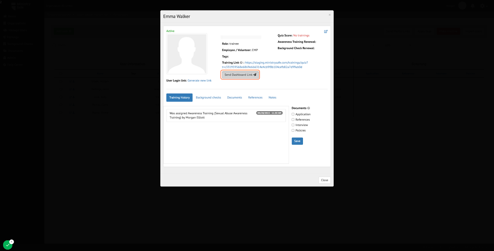- Click the 'Send Dashboard Link' to automatically send a Dashboard Link email to the user.
