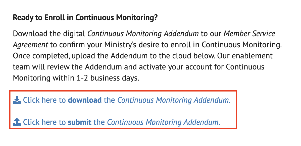 - Download, complete, and upload the Continuous Monitoring Addendum. Please allow 1-2 business days for our team to process the Addendum and enable Continuous Monitoring on your account. We will then notify you when your account is ready for user enrollment.