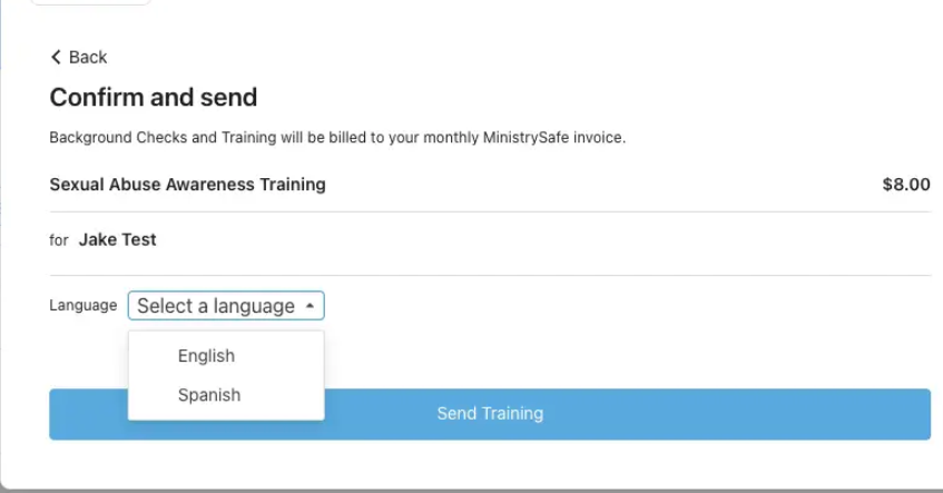 - Review the confirmation page, select the desired language, and click ‘Send Training’.