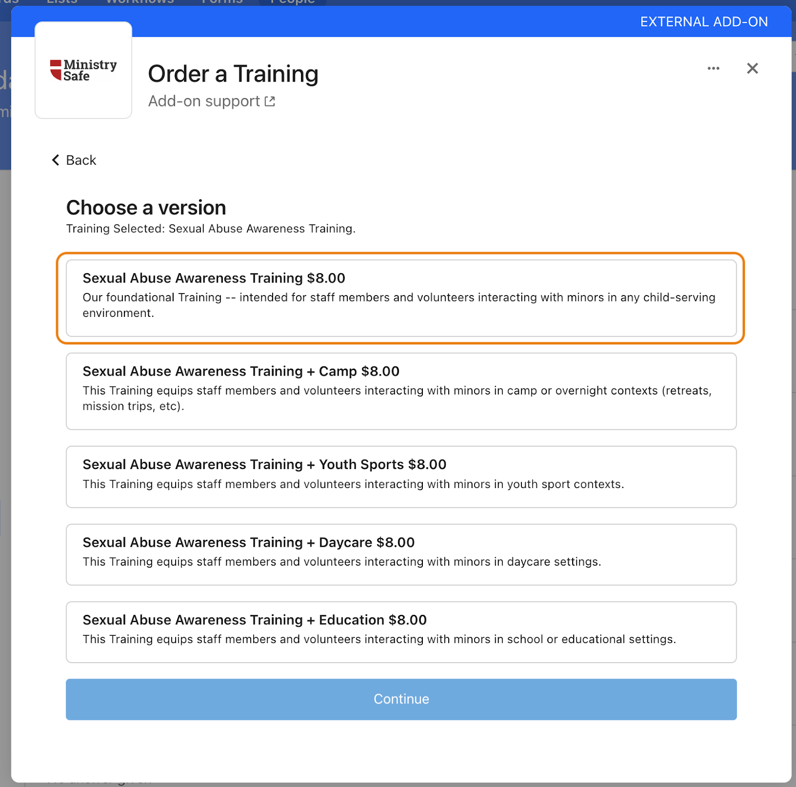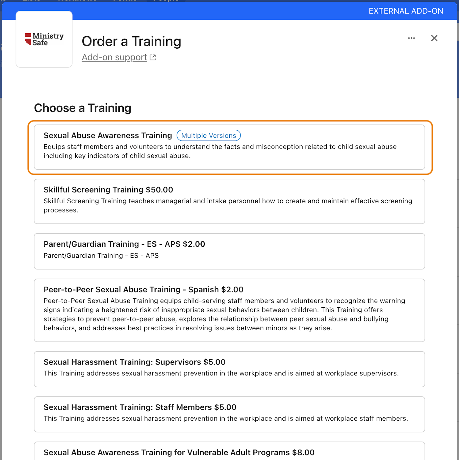 - Select ‘Sexual Abuse Awareness Training’ to see all versions and associated costs.